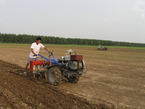 7月18日上午,在潘村湖农场一分场大田里,几辆耕田机正在进行播种作业。
