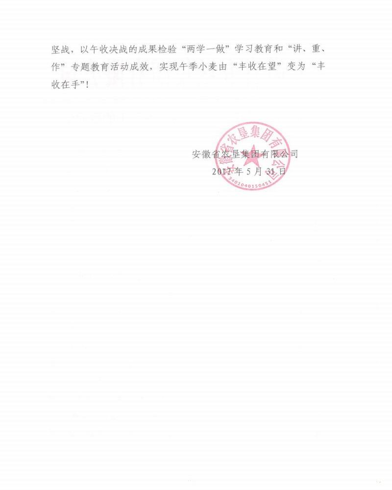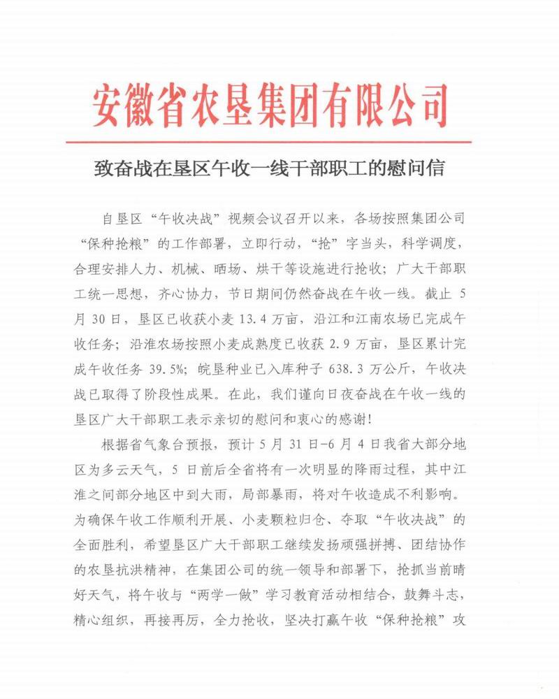 安徽农垦集团致信慰问午收一线干部职工