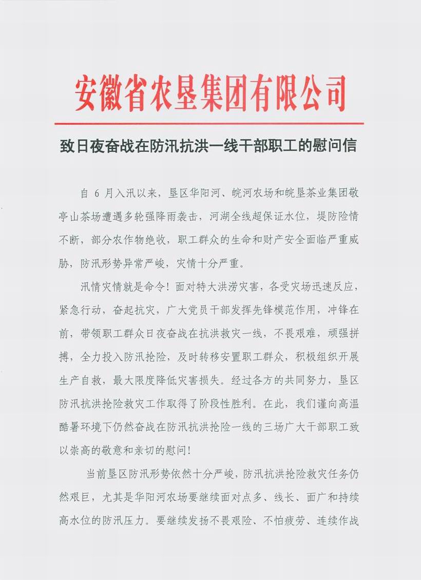 安徽农垦集团致信慰问抗洪一线干群