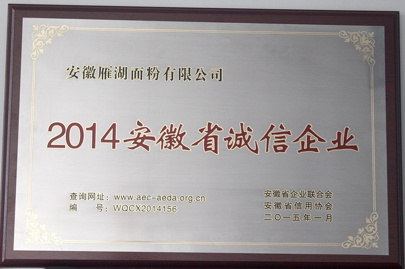 安徽农垦雁湖面粉有限公司获评2014安徽省诚信企业,这是企业诚信经营、履行社会责任、员工诚实做人结出的又一硕果。