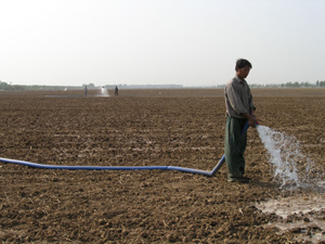 图片说明:全国农垦百家良种生产基地之一—潘村 湖农场立足抗旱抓秋种,到10月13日,已播种小麦 3000余亩。图为农工正在田间实施喷灌作业,确保 一播全苗。(杨登宏摄)