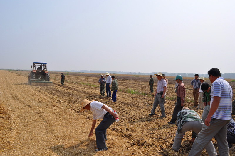611上午9时许,安徽农垦潘村湖农场四分场,随着最后一辆大型收割机从大田驶出,今年全场3万余亩麦收任务圆满收尾。与此同时,在一路之隔的二分场一块大田里,农场正在举行一场别开生面的机械灭茬暨夏种现场会,只见几台分别配置了秸秆粉碎机、反向旋耕机、复式播种机的大马力轮式拖拉机,正轰鸣着在田间作业。场领导柏华胜、孙华存、崔怀龙率机关蹲点干部、各分场管理人员、农机大户、职工代表等50余人,一边听着分场负责人介绍情况,一边仔细察看作业质量。